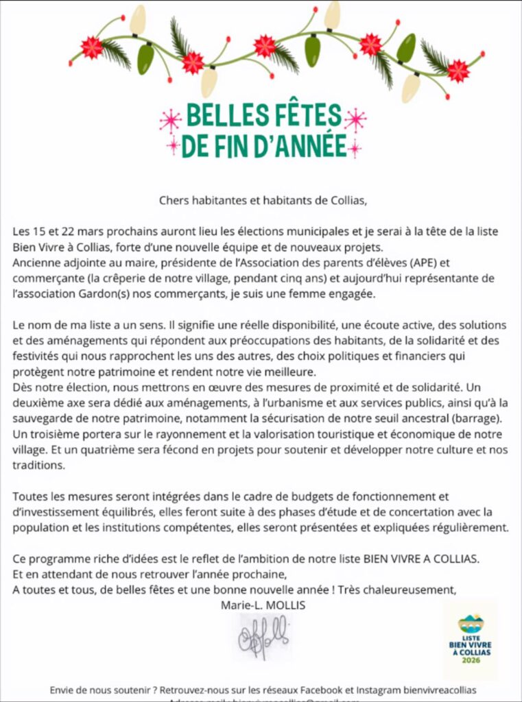 Nous souhaitons à toutes et à tous un très bon réveillon ici ou ailleurs, et si vous n’êtes pas Colliassois en ce moment voici la lettre que nous avons déposée dans votre boîte aux lettres.