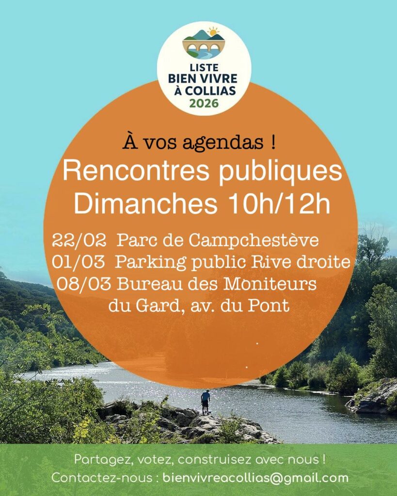 Envie de nous rencontrer ? D’échanger avec nous sur notre programme (bientôt dans vos boites aux lettres) et de partager vos idées pour Bien vivre à Collias pour les mois et années à venir ?